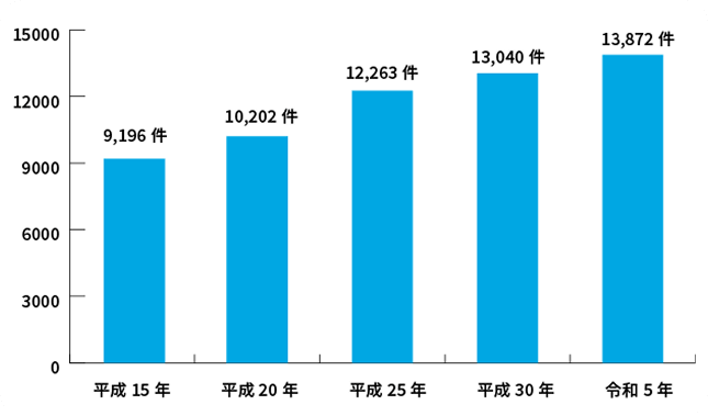 家庭裁判所へ持ち込まれる遺産分割争いの案件は年々増加傾向にあり、ここ20年で約1.5倍になっています。平成15年に9,196件であった遺産分割事件数が、令和5年には13,872件にまで増加しています。