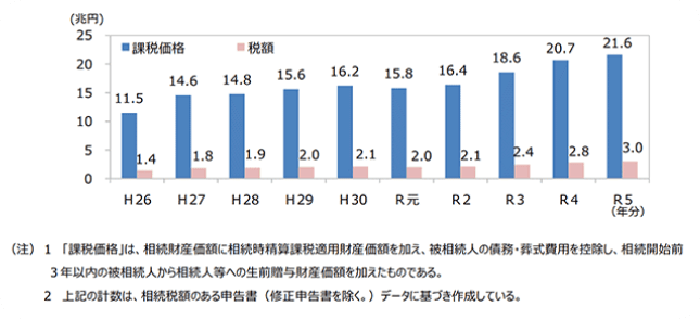 相続税の課税価格の総額は21兆6,335億円で前年比104.6% となっているが、これは昭和42年分以降で過去最高を更新した。申告税額の総額は3兆53億円で前年の2兆7989億円を7.4% 上回っている。平成26年度と比べて課税価格も申告税額も約2倍となっている。